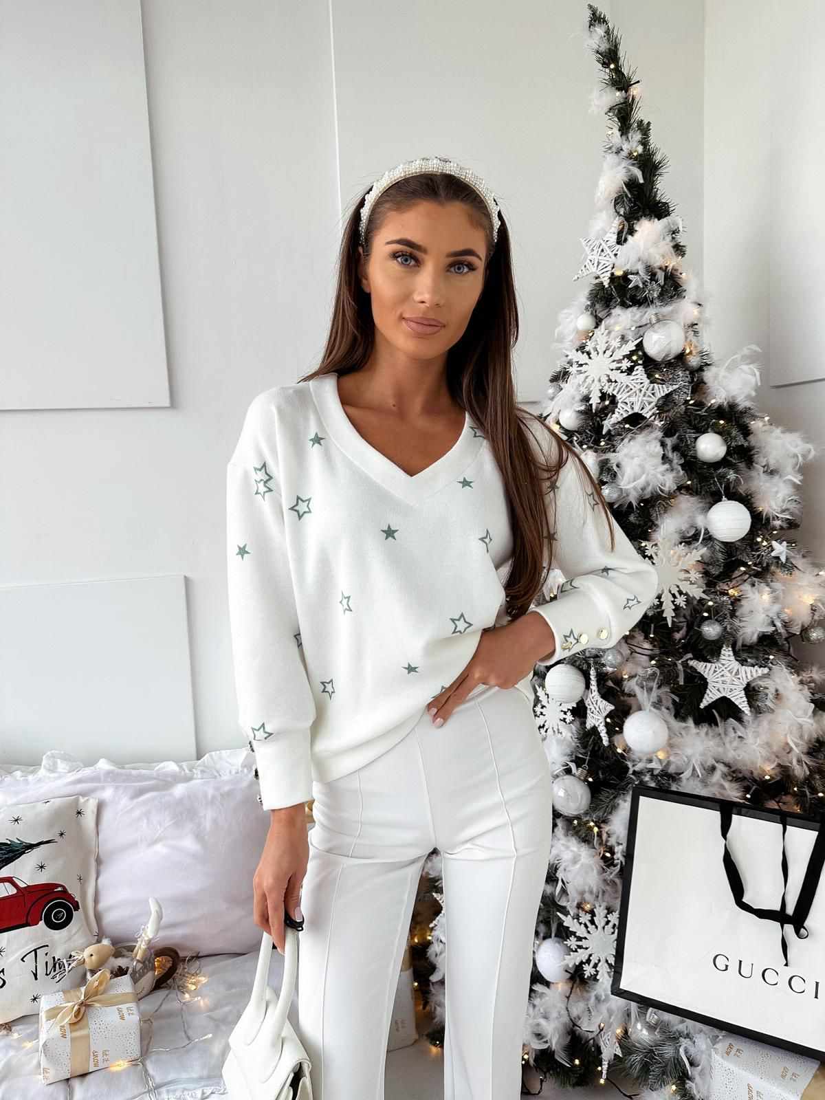 Emi márkájú, pihe-puha anyagú törtfehér színű lengyel felső, fenyő zöld színű csillag mintával.