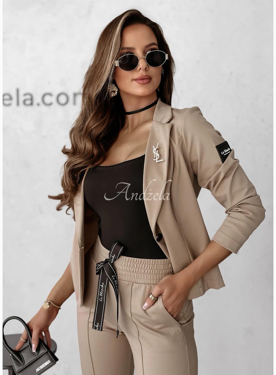 La Blanche márkájú, lengyel, sportosan elegáns kosztümszett. A zakó karcsúsított, gombos, ujján márkajelzéssel.A nadrág hátulja zseb nélküli, fenék kerekítős fazon.