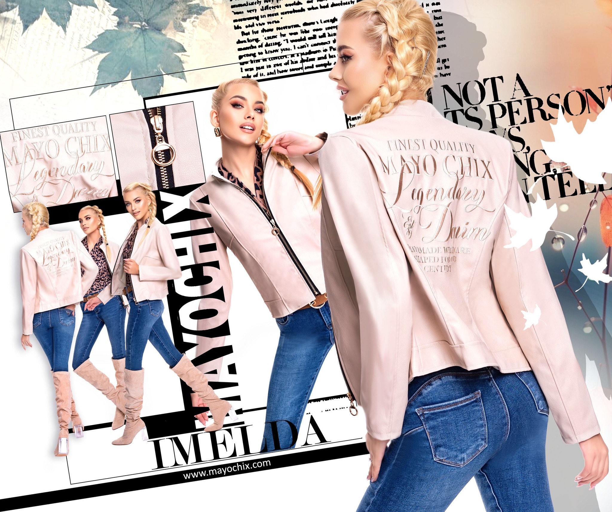Mayo Chix Imelda műbőr dzseki ecrü színben. Cippzáras záródású, klasszikus szabású dzseki, hátán hímzett márkajelzéssel.