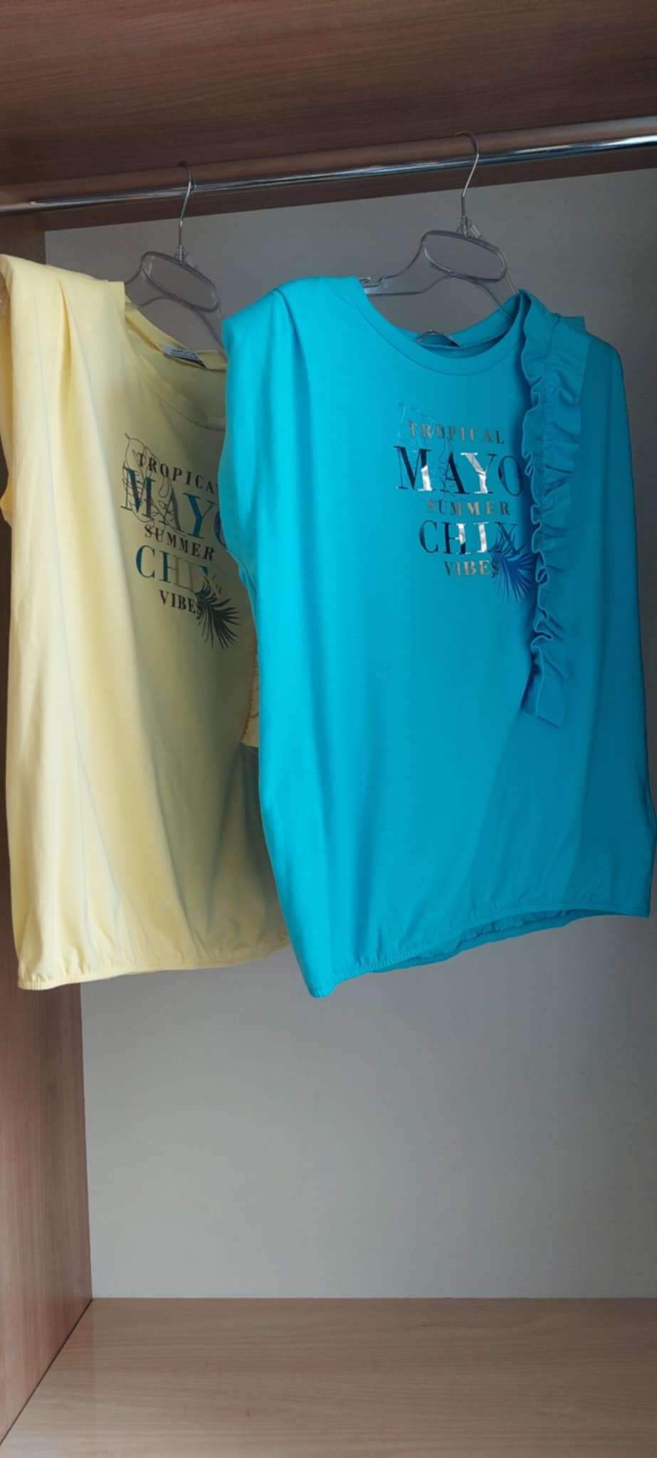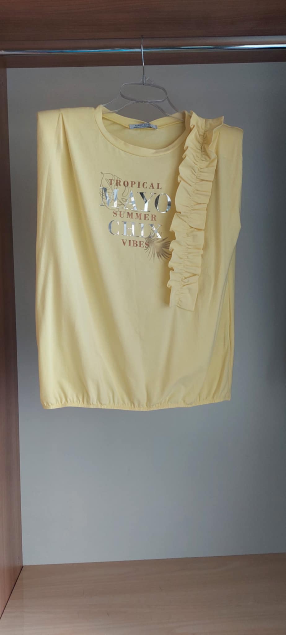 Mmayo Chix Roxy felső. Elasztikus anyagból készült lezser szabású póló válltöméssel, alján gumírozással, fodros és matricanyomott díszítéssel.