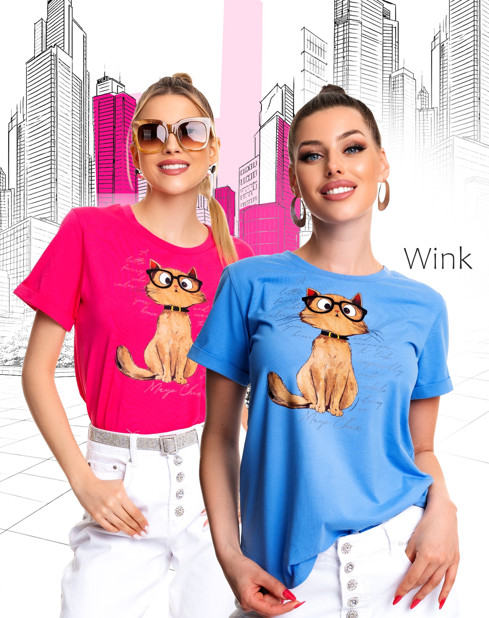 Mayo Chix Wink póló kék színben. Elasztikus anyagból készült egyenes szabásvonalú felső matricanyomott díszítéssel.