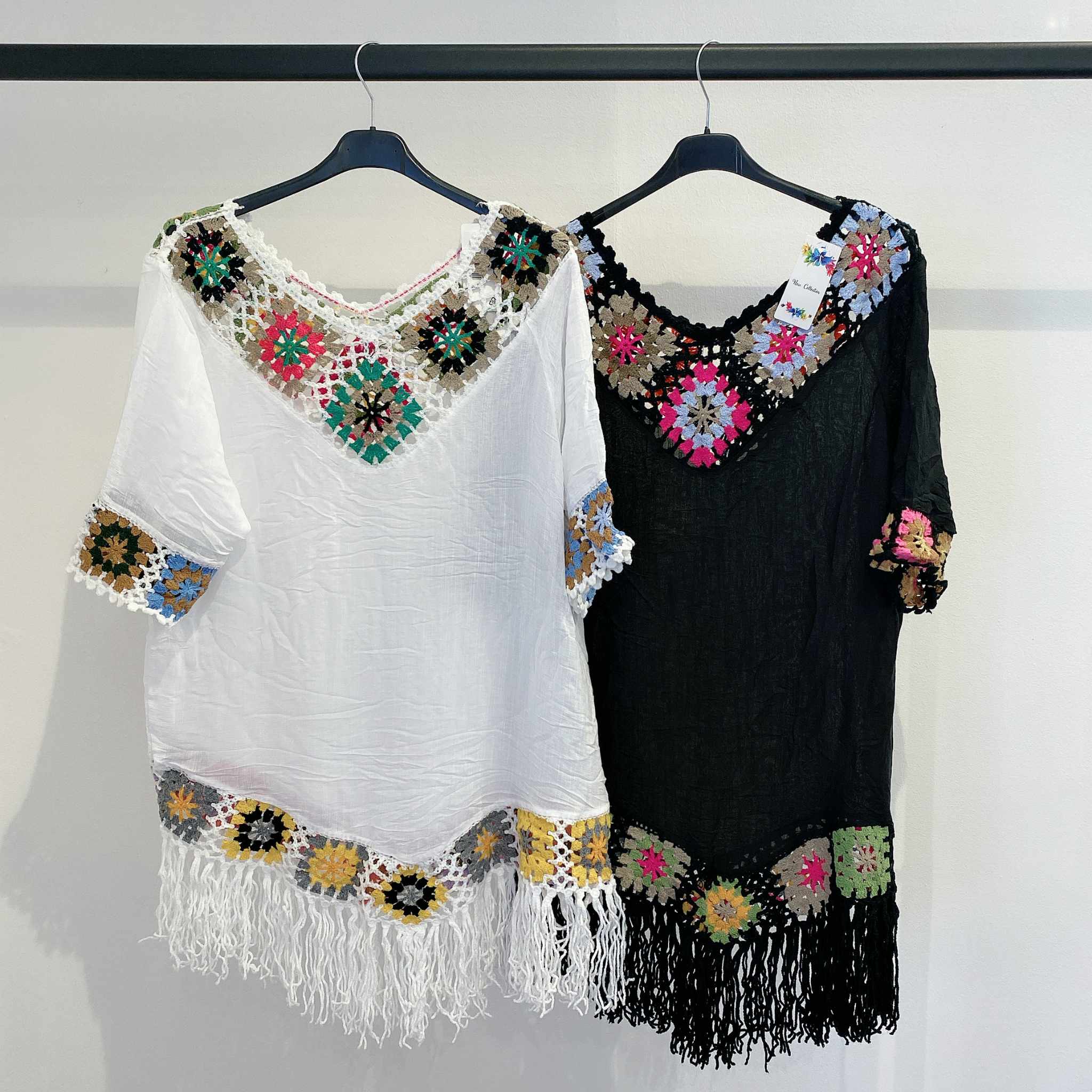 Nagyon könnyű hófehér strandruha, színes mintával.