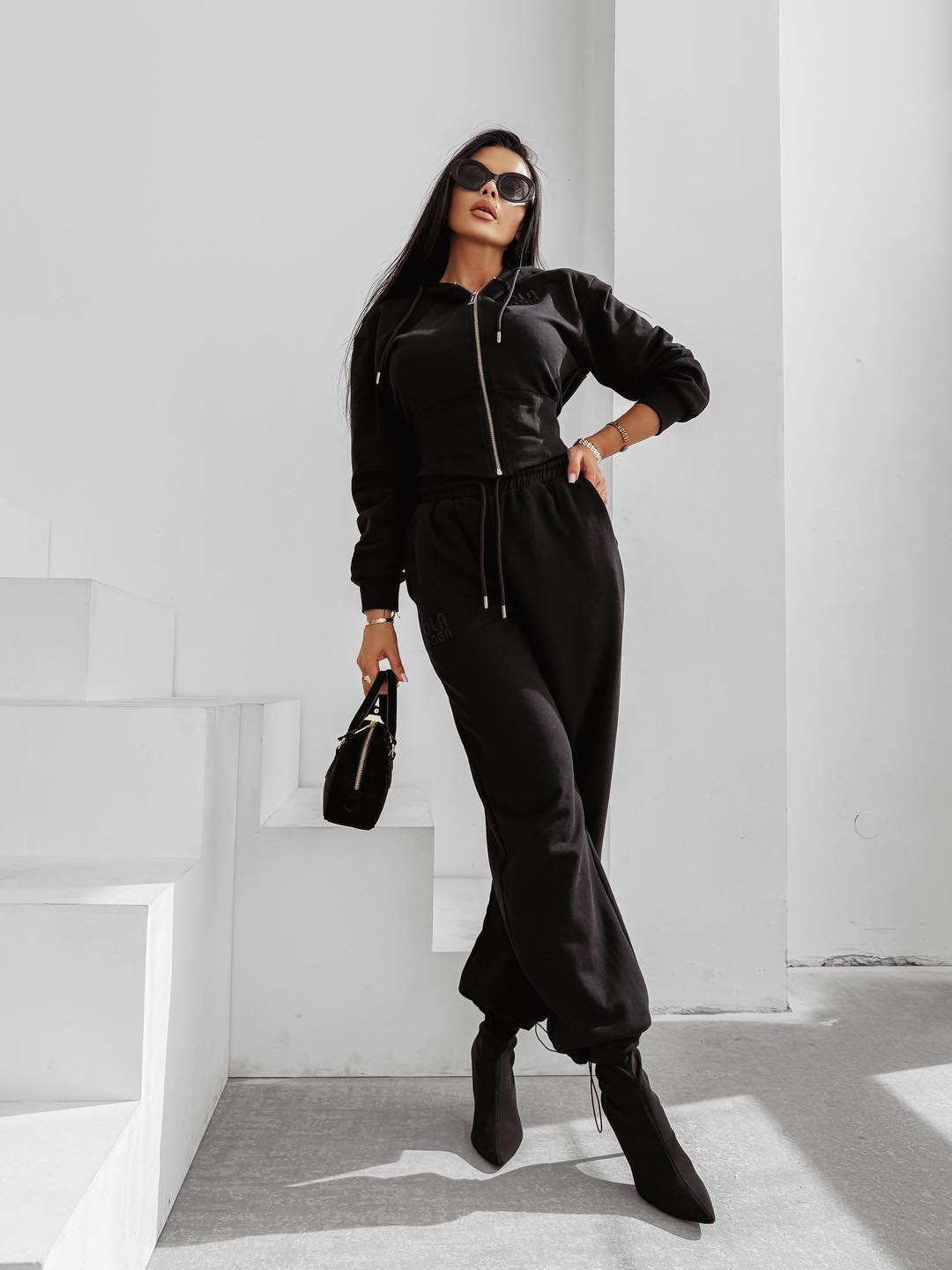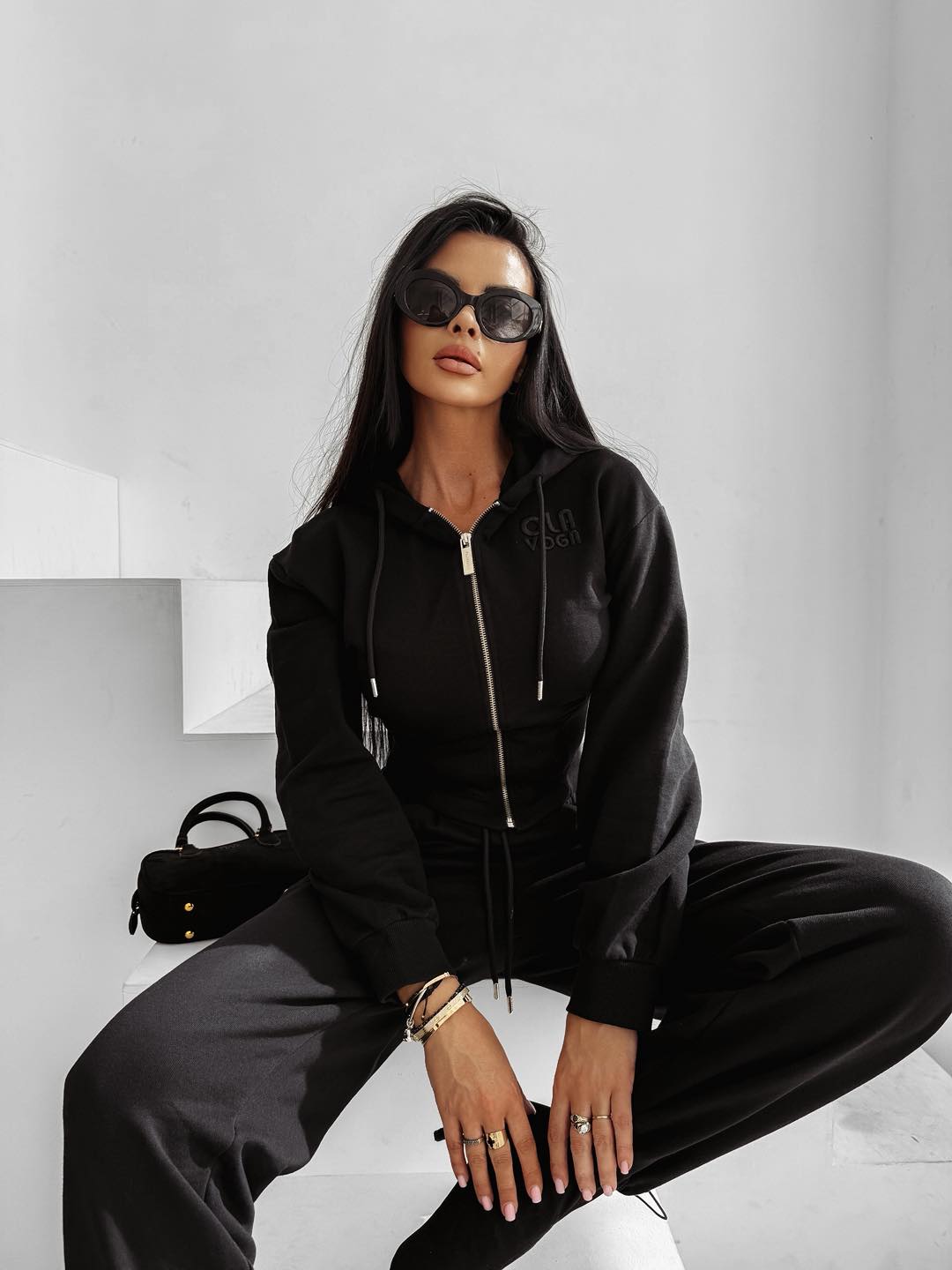 O La Voga Sanctuary sportos szett fekete színben. Kapucnis, cipzáros, rövidebb felsőrész és magas derekú nadrág, elején logónyomattal. Kicsit nagyobb méretezésű szett.